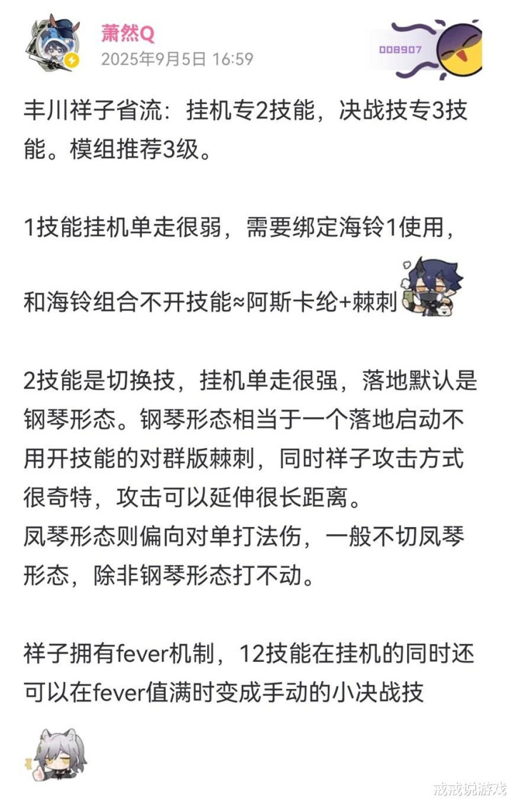 先来看看几个人们主播对于祥子的评价,萧某人:丰川祥子省流:挂机专2技能,决战技专3技能、模组推荐3级。 1技能挂机单走很弱,需要绑定海铃1使用 2技能是切换技,挂机单走很强,落地默认是钢琴形态。钢琴形态相当于一个落地启动不用开技能的对群版棘刺,同时祥子攻击方式很奇特,攻击可以延伸很长距离。 3技能就是朴实无华的对单决战技,缺点是对单没控制身板脆,优点是高dps高总伤还带双穿,fever期间还能锁血。
