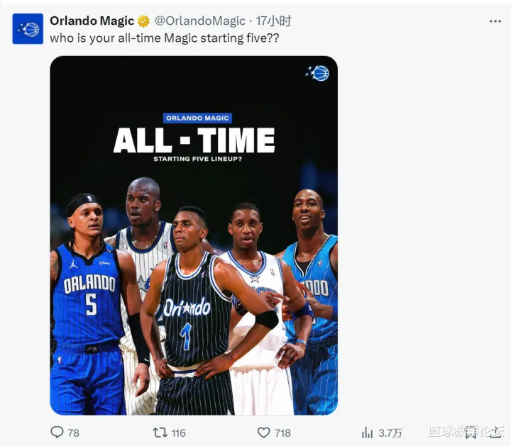 | 北京时间9月21日,魔术官方晒出一张海报,并发问:“你心目中魔术队史首发五人组是谁?”该海报包括:班凯罗、“便士”哈达威、麦迪、霍华德和奥尼尔。评论区的球迷表示,应该把班凯罗换成格兰特-希尔(健康版)或者特科格鲁。