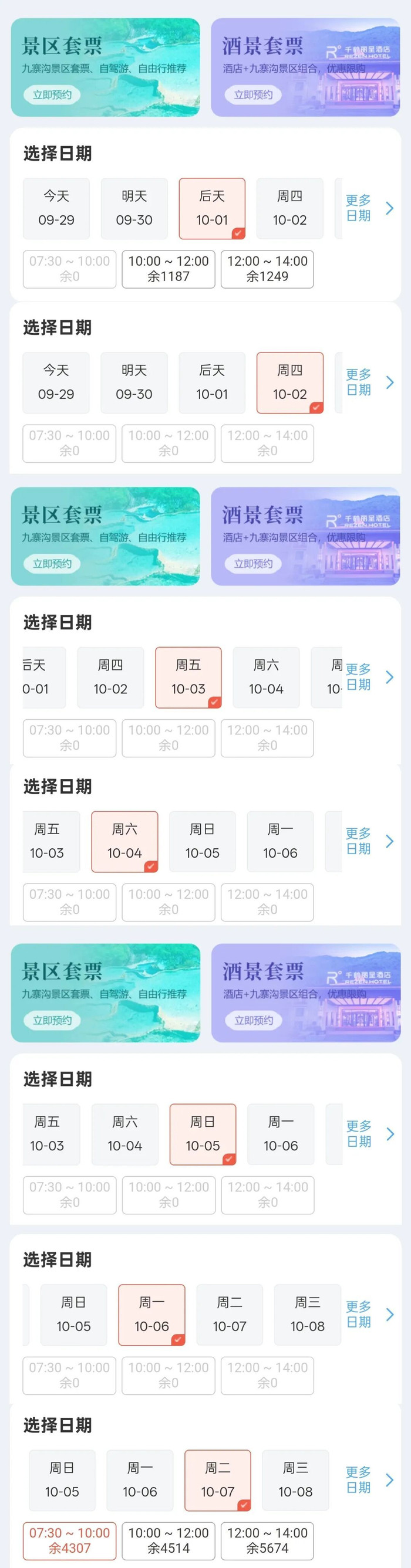 九寨沟景区 截至发稿时,九寨沟景区10月2日-7日全时段票售罄,10月1日部分时段、10月7日及以后还有余票。