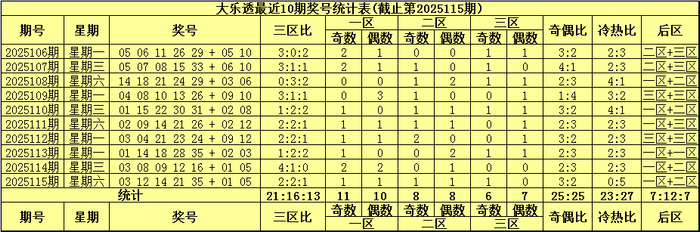袁启晨第2025116期大乐透分析: 前区冷热走势(遗漏值0-4为冷码,遗漏值4以上为冷码):上期以热码为主,开出全热码组合,最近10期冷热比为23:27,冷码相对低迷,本期预计冷码反弹回补,关注冷热比4:1。 前区奇偶分析:上期前区奇偶比为3:2,奇数号码较热,"最近10期奇偶比3:2出现了4次,其奇偶奖号总比例为25:25,奇偶号码开出比例基本持平,本期看好奇数号码转热,防奇偶比3:2再出。 前区三区走势:上期前区奖号三区比为2:2:1,最近10期前区奖号三区比为21:16:13。 前一区(01-12):最近10期出号21个,表现比较活跃,前区奇偶比为11:10,奇偶号码出号基本持平,上期前一区走温开出2个奖号,奇偶号码分别开出1个,本期预计前一区号码继续温冷,注意奇偶号码同时开出,关注号码05、08。 前二区(13-23):最近10期出号16个,走势与理论相当,前区奇偶比为8:8,奇偶号码出号基本持平,上期前二区走温开出2个奖号,奇偶号码分别开出1个,本期预计前二区号码继续温冷,注意奇偶号码同时开出,关注号码17。 前三区(24-35):最近10期出号13个,出号相对较少,前区奇偶比为6:7,奇偶号码出号基本持平,上期前三区较冷出现1个奖号,为奇数号码,本期预计前三区号码继续温冷,注意奇偶号码同时开出,关注号码25、32。 综上所述,大乐透第2025116期前区三区比看好2:1:2。