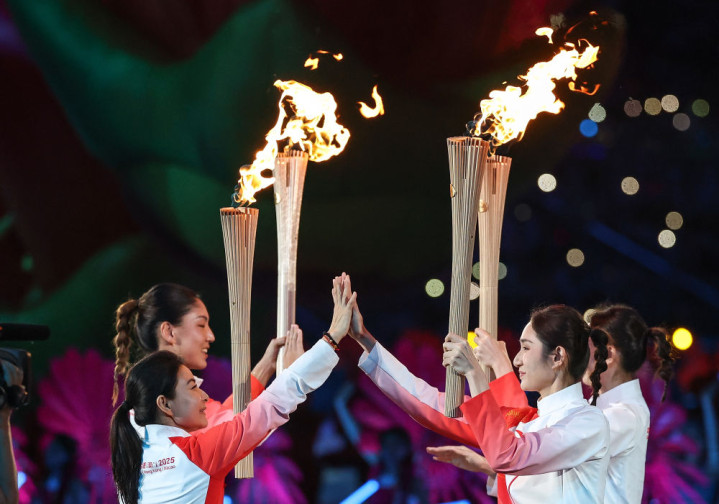 火炬手点燃主火炬。新华社记者肖艺九摄