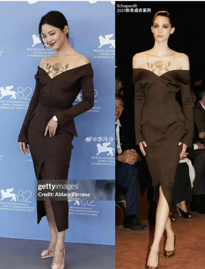 她的头发挽在脑后,还有点慵懒风,但整个人的气质都很不错,看看和模特的对比吧,这一套衣服她选得极好,很好将自己的好身材呈现了出来。 也很符合她的气质。