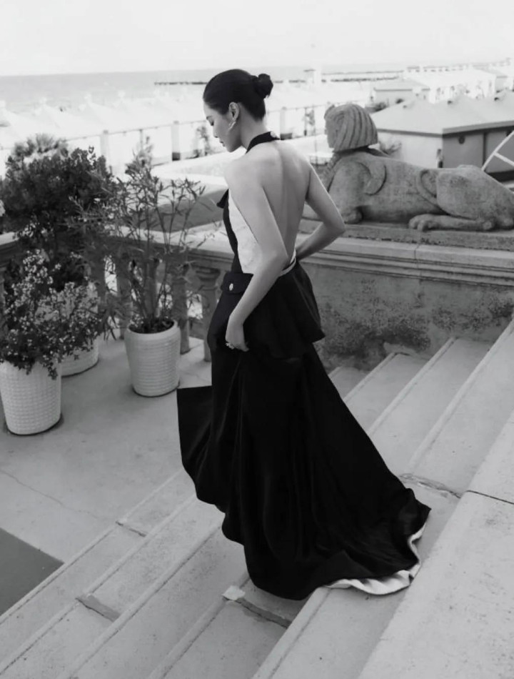 在红毯环节,辛芷蕾穿着一件大露背的黑色长裙,很有质感显气质,辛芷蕾走在红毯之上,还是一如既往的大气和自信。 这一套衣服还是一个大露背款式的,从前面看没有什么,但是从后面看就很大胆很性感了。 这一组做成了黑白色就更加高级了,还有点赫本的质感,辛芷蕾的背部线条很突出,也很流畅,是天生的电影脸了。
