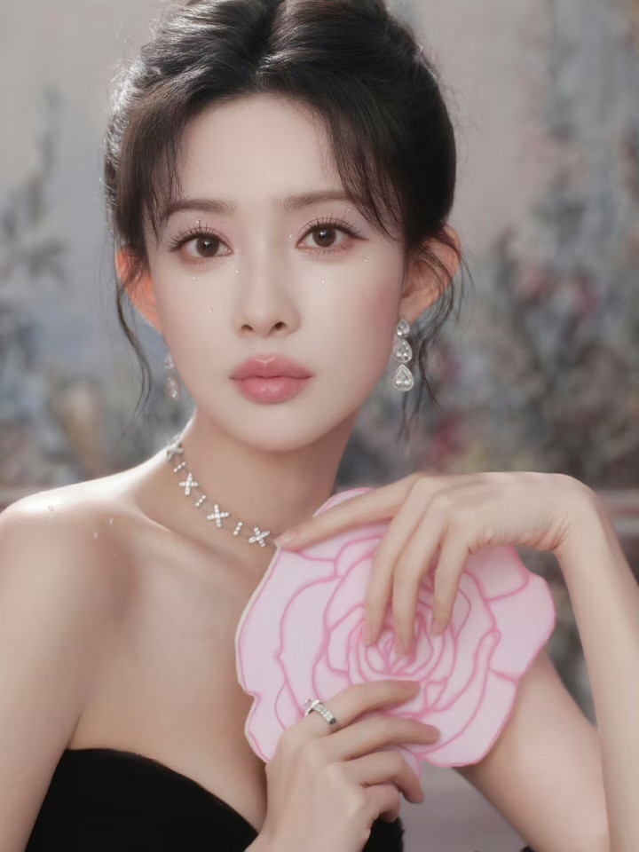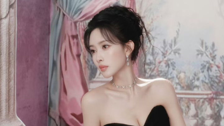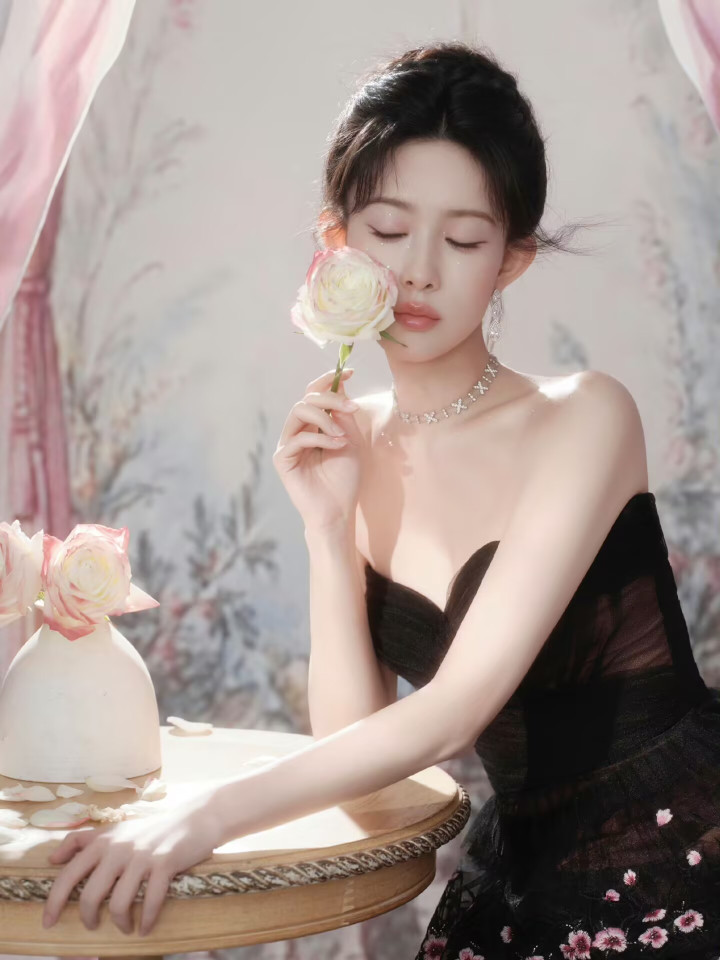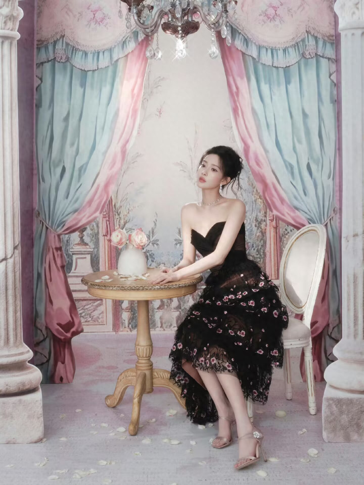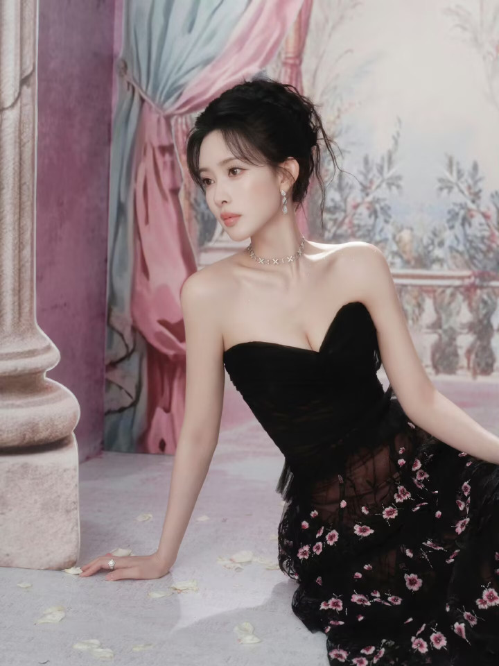 孟子义 31 岁复古繁花裙,抹胸勾勒肩颈线,优雅似宫廷玫瑰