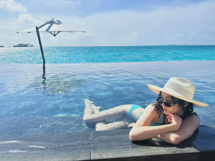 画面一转,关晓彤全身出镜啦,大家也罕见看到了她穿着泳装的绝美姿态。照片中,关晓彤上半身趴在泳池边,而腰和大长腿都浸泡在泳池里。她惬意地趴在泳池边摆pose,随手一拍都有种大片既视感。 而且关晓彤的身材曲线真的太绝美了,她的胳膊又细又长,小蛮腰更是妥妥地“巴掌腰”,而大长腿就更不用多说了,又细又直又长,腰臀比也是超绝。真是没想到,关晓彤穿上泳装竟然如此有韵味,属实是惊艳到大家啦。