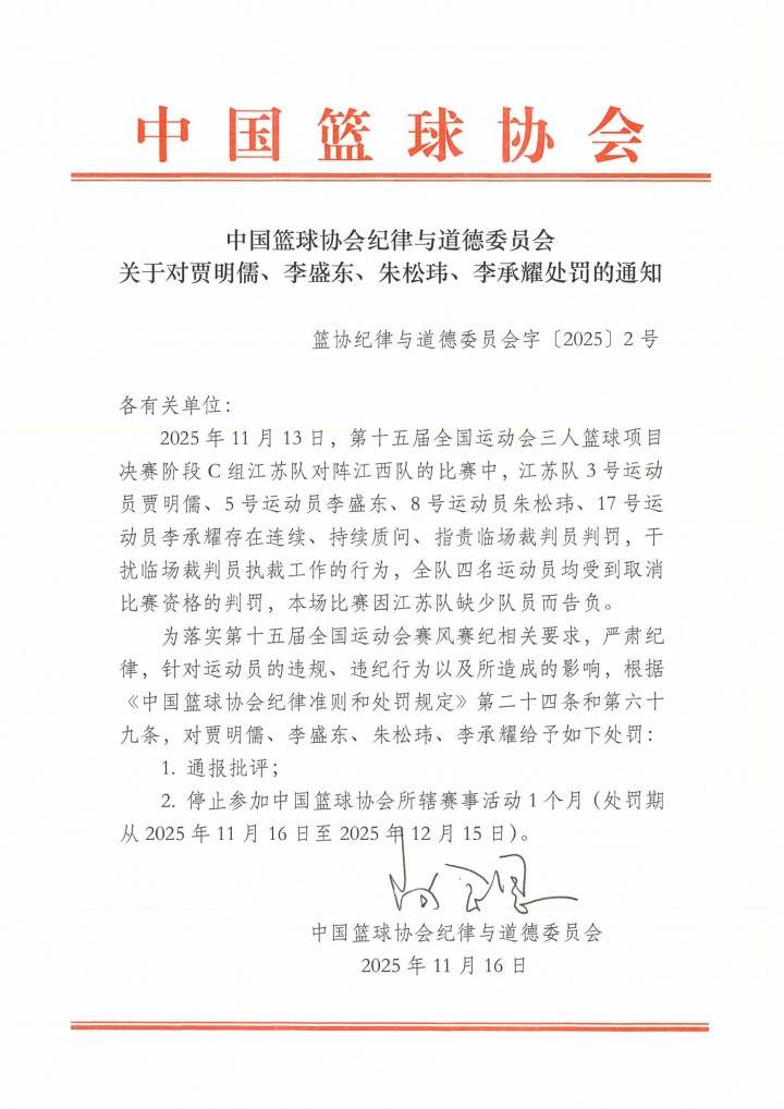 直播吧11月16日讯中国篮球协会纪律与道德委员会官方宣布,给予全运会三人篮球项目江苏队队员贾明儒、李盛东、朱松玮和李承耀通报批评和停止参加中国篮协所辖赛事活动1个月的处罚,原因是他们四人存在连续、持续质问、指责临场裁判员判罚、干扰临场裁判员执裁工作的行为。