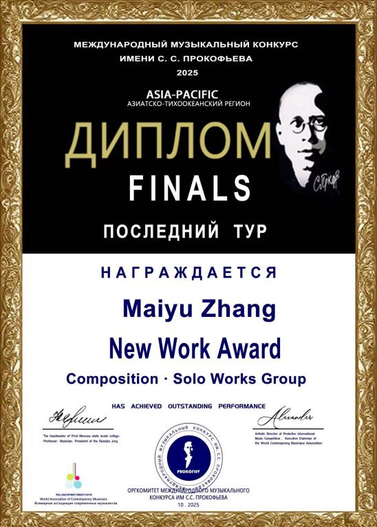 近日,在国际音乐界具有广泛影响力的“2025年普罗科菲耶夫国际音乐比赛(亚太赛区)”结果正式揭晓,张脉予、富倩瑜、张翰文、吴依霖等多位中国青年音乐人在比赛中摘得重要奖项,再次在国际舞台上展现了中国音乐人的创作实力! 国际权威赛事 近千名选手竞逐 普罗科菲耶夫国际音乐比赛是1991年由俄罗斯联邦文化部,为纪念伟大作曲家普罗科菲耶夫诞辰100周年而设立的重要国际音乐赛事。2002年获得联合国教科文组织的支持与赞助,2012年被中国文化部列为鼓励参加的国际比赛。经过数十年发展,该赛事已获得全球80余所高等艺术院校及多国文化部门的支持与认可。 本届比赛由俄罗斯莫斯科州国立第一音乐学院主办,世界当代音乐家协会、普罗科菲耶夫国际艺术中心承办。 本届亚太赛区比赛也是疫情后的首次重启,吸引了来自中国、俄罗斯、日本、韩国、美国、新加坡、澳大利亚、匈牙利、西班牙、德国、波兰、意大利等国家的近千名选手参与,比赛设钢琴、声乐、作曲、管乐、弦乐等30余个项目组别。 赛事创新采用线上线下相结合的形式,线下决赛于10月5日在上海上音歌剧院圆满落幕,线上决赛则于10月13—20日通过网络平台展播和评委实时评分的方式进行,共同角逐此次比赛30余个项目组别的金奖、银奖、铜奖、评审团特别奖、最具潜力奖等奖项。