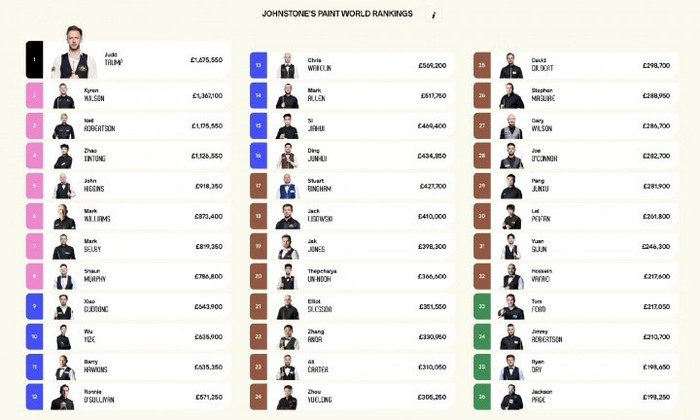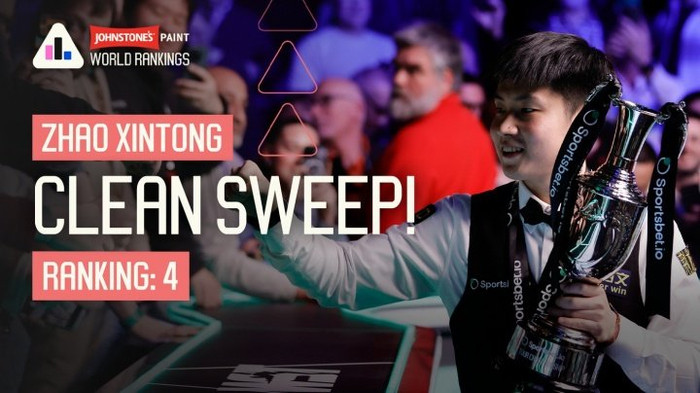| [#赵心童世排第4创新高#]#赵心童两月三冠#2026斯诺克巡回锦标赛决赛,赵心童10-3特鲁姆普夺得冠军,两个月内斩获个人第三座排名赛冠军,接连拿下世界大奖赛、球员锦标赛与巡回锦标赛,成功包揽球员系列赛。 WST官网正式更新世界排名,赵心童排名上升一位,首次正式跻身世界前四!赵心童的的奖金积分达到1,126,550镑,世界第一特鲁姆普的奖金积分是1,675,550镑,相差54.9万镑。 2026斯诺克世锦赛将于2026年4月18日至5月4日在英国谢菲尔德的克鲁斯堡剧院举行,特鲁姆普十分有望在下赛季开始前守住世界第一宝座,但WST官方表示,赵心童仍有机会登顶世界第一宝座,他必须在克鲁斯堡卫冕价值50万英镑的冠军,且特鲁姆普需在首轮出局。此外,尼尔·罗伯逊同样具备登顶世界第一的可能,他同样需要夺冠,且特鲁姆普在1/4决赛前出局。(直播吧)
