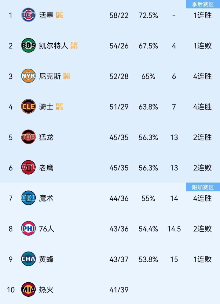 猛龙升至东部第五 热火以114-128不敌猛龙。热火本赛季对猛龙0胜4负、对凯尔特人0胜4负、对魔术0胜5负,合计战绩为0胜13负。本场比赛过后,猛龙与热火本赛季常规赛的四战全部结束,猛龙取得4-0完成对热火的横扫,且每一场比赛猛龙都净胜两位数分差。此战过后,猛龙战绩来到45胜35负追平老鹰,凭借胜负关系优势反超到东部第五。北京时间明日7:30,猛龙将背靠背客场挑战尼克斯。