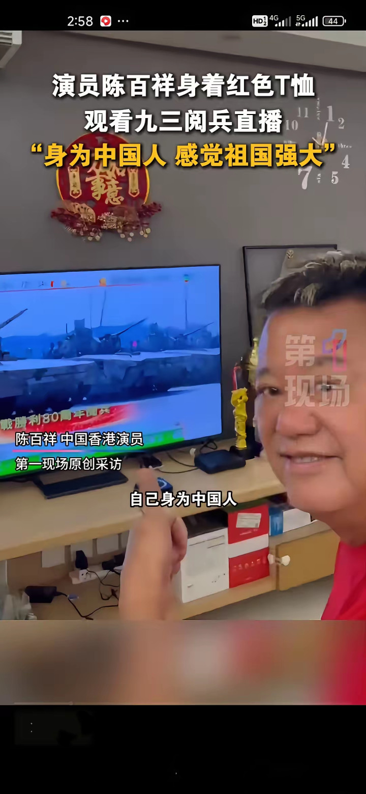 | 2025年9月3日,中国人民抗日战争暨世界反法西斯战争胜利80周年纪念日当天,中国香港演员陈百祥身着红色T恤,在家中认真观看九三阅兵直播。当受阅方阵迈着铿锵步伐通过天安门广场,他激动地挥舞手中的国旗,眼中闪烁着泪光:“身为中国人,看到祖国军事力量如此强大,我感到无比自豪!”