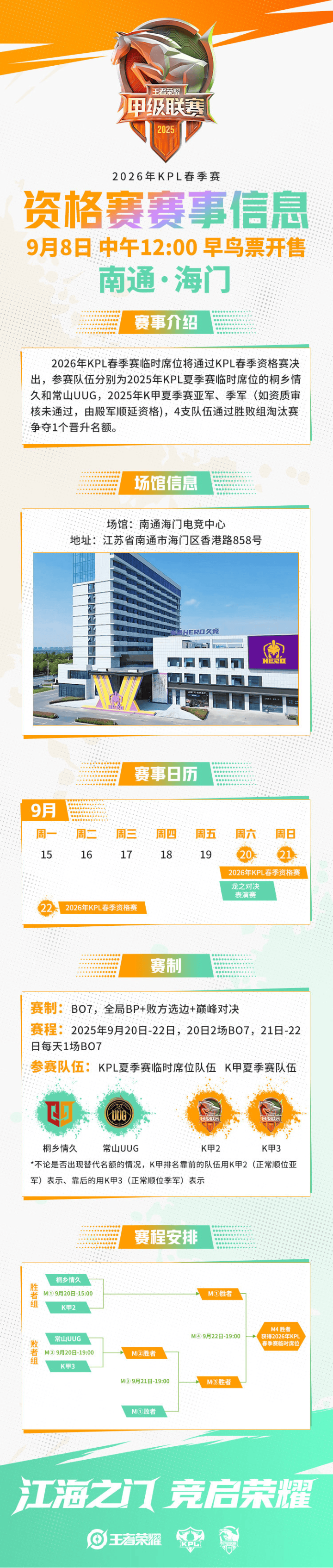 虎扑09月06日讯2026年KPL春季资格赛赛事信息公布:落地海门,4队争1个名额 原文如下: 2026年KPL春季资格赛赛事信息来啦~ 2026年KPL春季资格赛早鸟票将于9月8日中午12点开售! 2026年KPL春季赛临时席位将通过KPL春季资格赛决出,参赛队伍分别为2025年KPL夏季赛临时席位的桐乡情久和常山UUG,2025年K甲夏季赛亚军、季军(如资质审核未通过,由殿军顺延资格),4支队伍通过胜败组淘汰赛争夺1个晋级名额。 场馆地址:江苏省南通市海门区香港路858号(南通海门电竞中心) 赛制:本届KPL春季赛资格赛采用BO7,全局BP+败方选边+巅峰对决赛制; 比赛时间为9月20日至22日。其中,9月20日进行两场BO7对决,9月21日至22日每天进行一场BO7对决。 详细赛事信息如下方图片所示,想要线下观赛的小伙伴们,请关注小k获取实时更新的观赛福利吧!