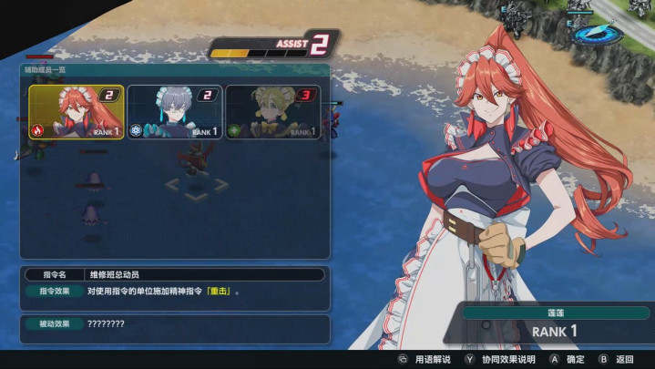 在系统方面,本作最引人瞩目的新设计有两个,第一就是《辅助连结》功能,顾名思义这是提供各种BUFF效果的辅助工具。通过在战斗中击破敌方机体,玩家可以积累《辅助计数》这种新概念资源,消耗辅助计数即可发动机体与辅助角色之间的连结效果,包括回复机体、提升伤害、侦查敌方情报等多种效果。辅助角色又以红绿蓝颜色分为三种类型,如果将三名以上相同类型的辅助角色一起加入编组,还会触发更强大的协同效果。参与任务次数和辅助连结次数越多,辅助角色就会逐渐提升等级并解锁更多被动效果。毕竟战棋游戏上阵角色数量往往是有限的,辅助连结功能不仅重构了资源管理和后勤支援的机制,而且让更多人物获得了通过这种方式参与战斗的机会,对于老观众来说也算是提供了发挥更多角色爱的可能性。