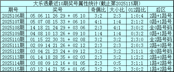 大乐透第2025115期开奖号码:03 12 14 21 35 + 01 05。前区奖号大小比为2:3,奇偶比为3:2,012路比为3:0:2,后区为1路+2路号。
