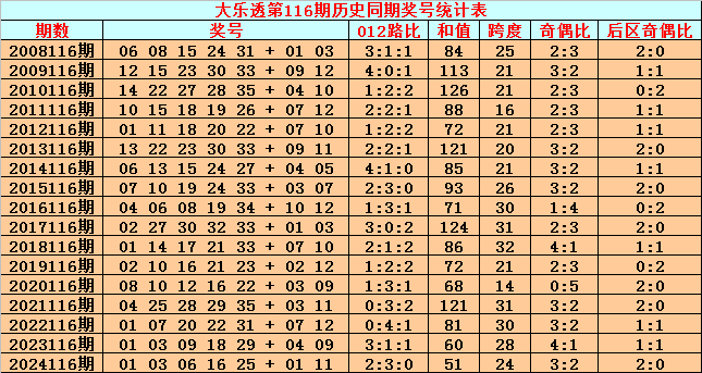后区分析:在第116期历史同期开奖中,后区奖号全奇组合开出7次,全偶组合开出3次,一奇一偶组合开出7次,本期后区预计出现一奇一偶组合,看好号码03、07、08、10。