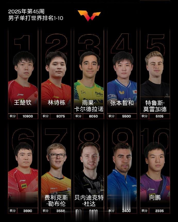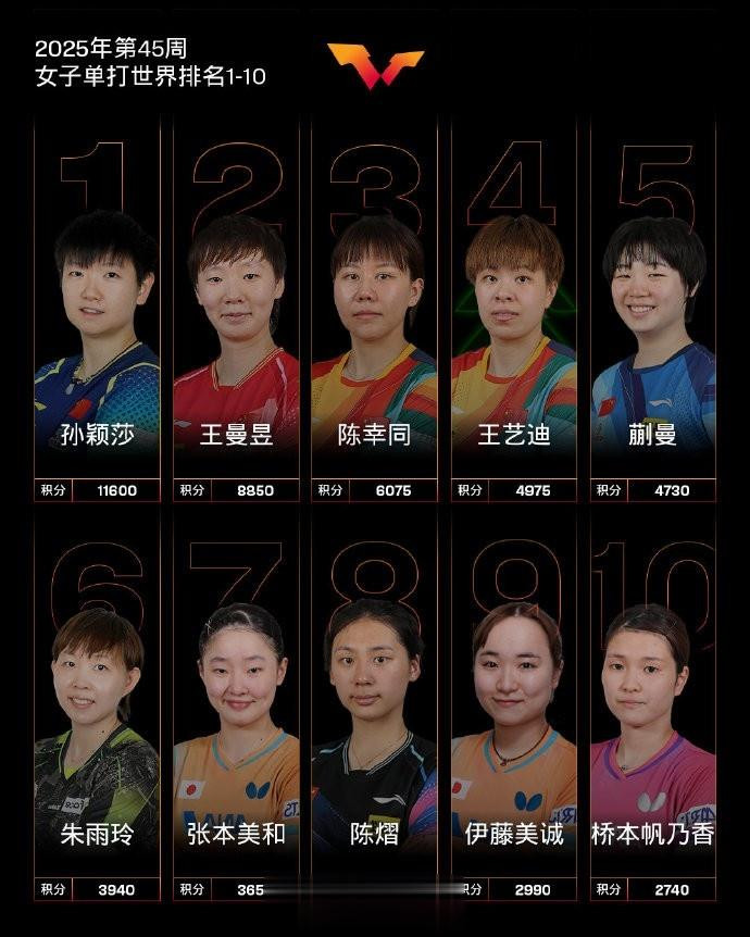 直播吧11月4日讯国际乒联更新最新一期世界排名,孙颖莎和王楚钦位列各单项世界第一。 男子单打,中国队球员王楚钦、林诗栋位列前二,梁靖崑位列第六,向鹏位列第十。其他中国队球员,陈垣宇排名第24,周启豪排名第34,陈俊菘排名第45,林高远排名第46,黄友政排名第49。 女子单打,中国队球员孙颖莎、王曼昱、陈幸同、王艺迪、蒯曼位列前五,陈熠位列第八。 其他中国队球员,石洵瑶排名第11,钱天一排名第23,何卓佳排名第25,覃予萱排名第35,王晓彤排名第42,范姝涵排名第50。 女单世界前10分别为:孙颖莎、王曼昱、陈幸同、王艺迪、蒯曼。朱雨玲第六,张本美和第七,陈熠第八,伊藤美诚第九,桥本帆乃香第十。 男单世界前10分别为:王楚钦排名第一,林诗栋排名第二,雨果排名第三,张本智和排名第四,莫雷加德排名第五,梁靖崑排名第六,小勒布伦排名第七,杜达排名第八,达科第九,向鹏第十。