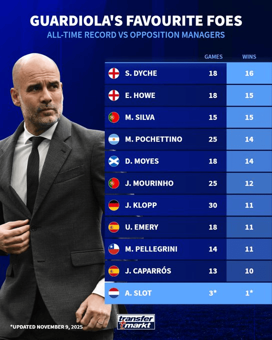 虎扑11月10日讯英超第11轮焦点战,曼城主场3-0完胜利物浦。本场比赛,瓜迪奥拉的执教生涯迎来重要里程碑,他在1000场比赛中获得了716场胜利。 德转盘点了瓜迪奥拉在面对不同教练时的胜率,具体数据如下: 1.肖恩-戴奇:18场比赛,16场胜利 2.埃迪-豪:18场比赛,15场胜利 3.马尔科-席尔瓦:15场比赛,15场胜利 4.波切蒂诺:25场比赛,14场胜利 5.大卫-莫耶斯:18场比赛,14场胜利 6.穆里尼奥:25场比赛,12场胜利 7.克洛普:30场比赛,11场胜利 8.埃梅里:18场比赛,11场胜利 9.佩莱格里尼:14场比赛,11场胜利 10.卡帕罗斯:13场比赛,10场胜利 11.斯洛特:3场比赛,1场胜利 |