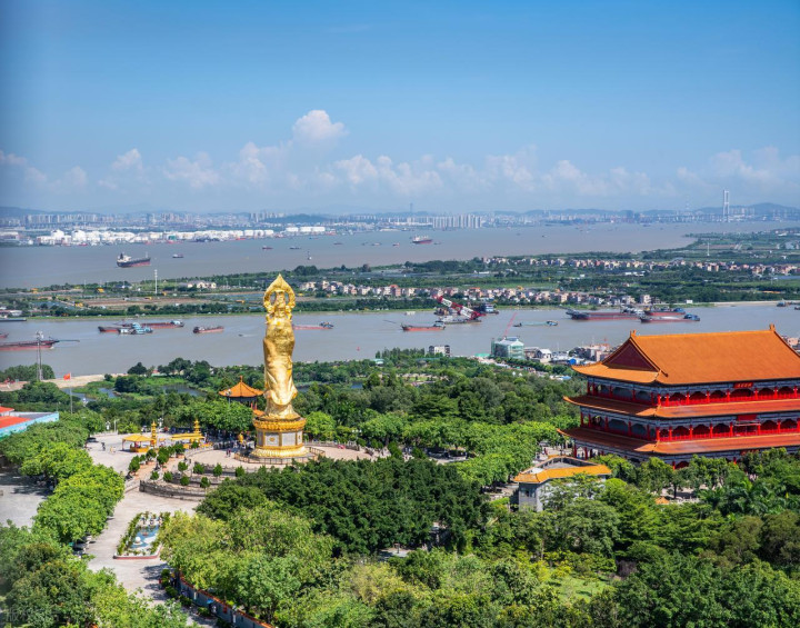 番禺石楼赤松宫 俯瞰呈巨型葫芦,象征福禄吉祥; 星宿殿圆形天幕+AI 解签,赛博拜神超有趣; 龙王殿池水能见度 1 m+,锦鲤“触须根根分明”。 免费免预约,但香火区限 3 支清香(门口 5 元/把);想拍“天宫”视角,带广角+无人机需提前在游客中心报备。 3 莲花山——40.88 m 世界最高贴金望海观音