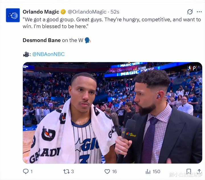 赛后贝恩接受里弗斯的采访,他谈到魔术队:我们是一支很棒的球队 ,队内有很多很出色的小伙子,他们有进取心,都想赢球,我很幸运能来这样打球。