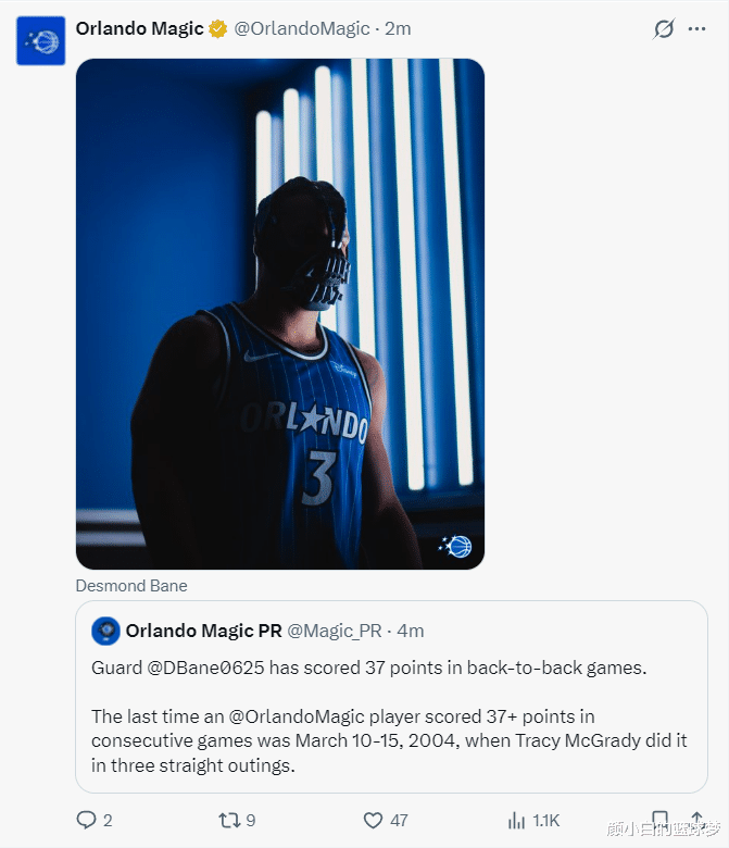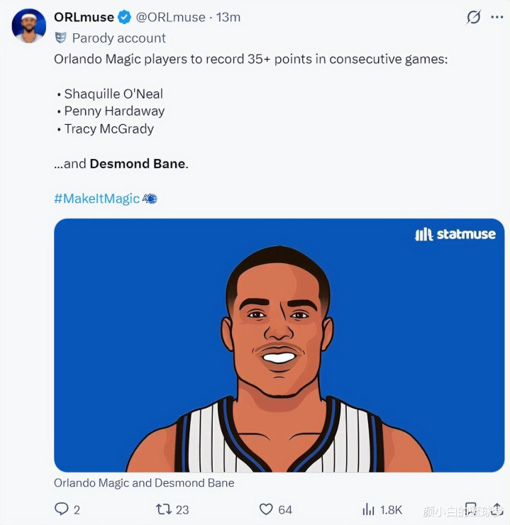 3.他是魔术队史第四位能连续两场比赛都拿到35+的球员:奥尼尔、哈达威、麦迪、贝恩;